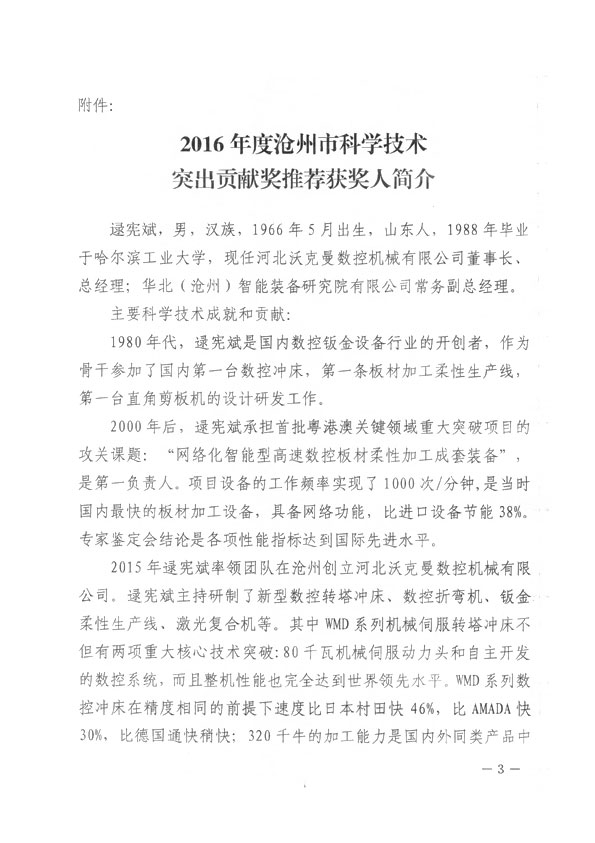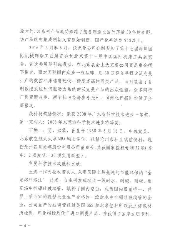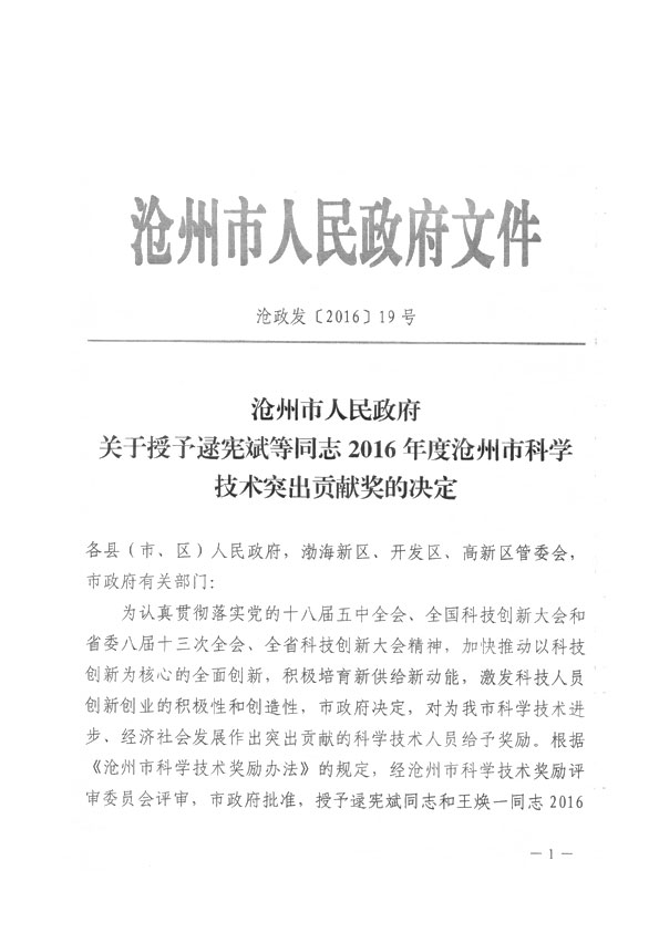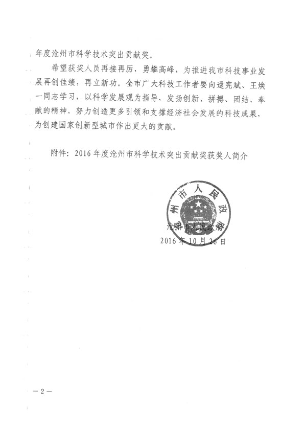 滄州市人民政府授予王煥一先生2016年科學技術突出貢獻獎
